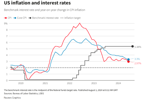 在美国通胀率令人欣慰地出现回落态势之后,美联储主席杰罗姆·鲍威尔周三暗示,美联储将在9月份进行本轮周期中的首次降息。目前,美国联邦基金利率已经在5.25%-5.5%的高位区间停留了一年之久,美联储面临着将重点转向应对经济疲软和失业率上升的风险。利率市场当前预计美联储在年内仅剩的三次会议中都将降息。