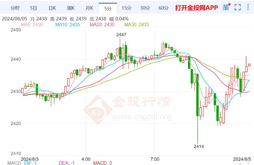 周一(8月5日)本交易日现货黄金日内维持震荡走势,今日开盘报2442.15美元/盎司,最高触及2446.99美元/盎司,最低触及2413.80美元/盎司,截止发稿金价报2438.04美元/盎司,跌幅0.20%。美国6月新增非农就业20.6万人,较5月的27.2万人大幅回落,失业率意外上升至4.1%,创下2021年12月以来新高;平均小时工资同比上涨3.9%,为2021年7月以来最低。数据表明,美国非农就业和薪资增速放缓,失业率已连续3个月上升,劳动力市场逐渐降温,为美联储9月降息提供了有利条件。