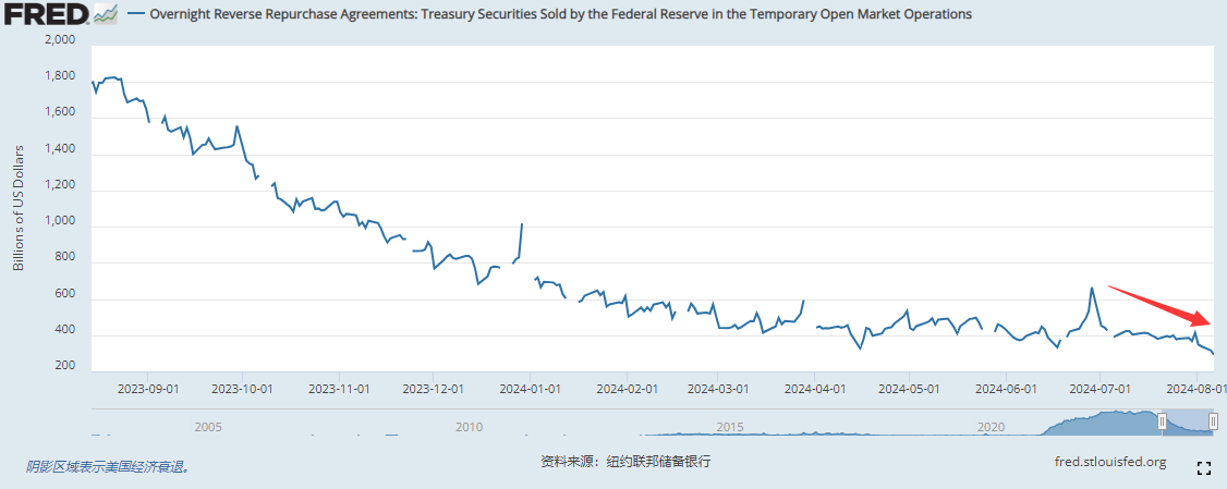 财联社8月7日讯(编辑 潇湘)根据纽约联储的数据显示,本周二美联储逆回购工具使用量,自2021年年中以来首次跌破了3000亿美元。