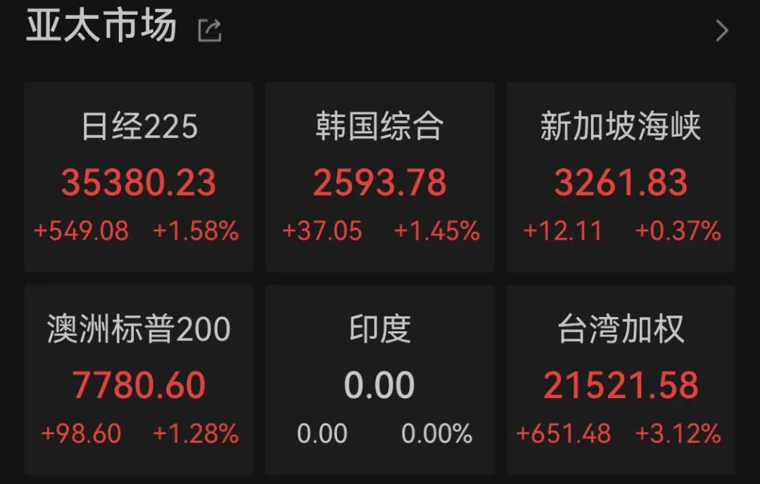 亚太市场方面,日本、韩国等股指纷纷大涨。