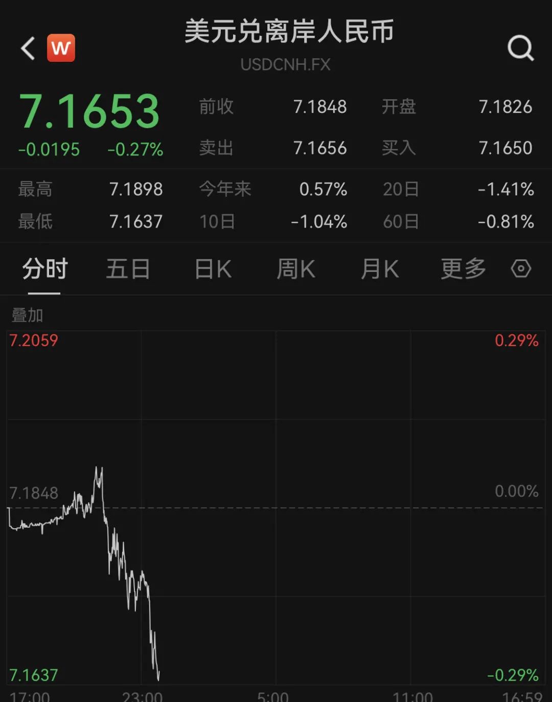 今日早盘,A股市场开盘后不久,人民币汇率直线上升,截至记者发稿,美元兑人民币报7.1653,上午整体窄幅波动。