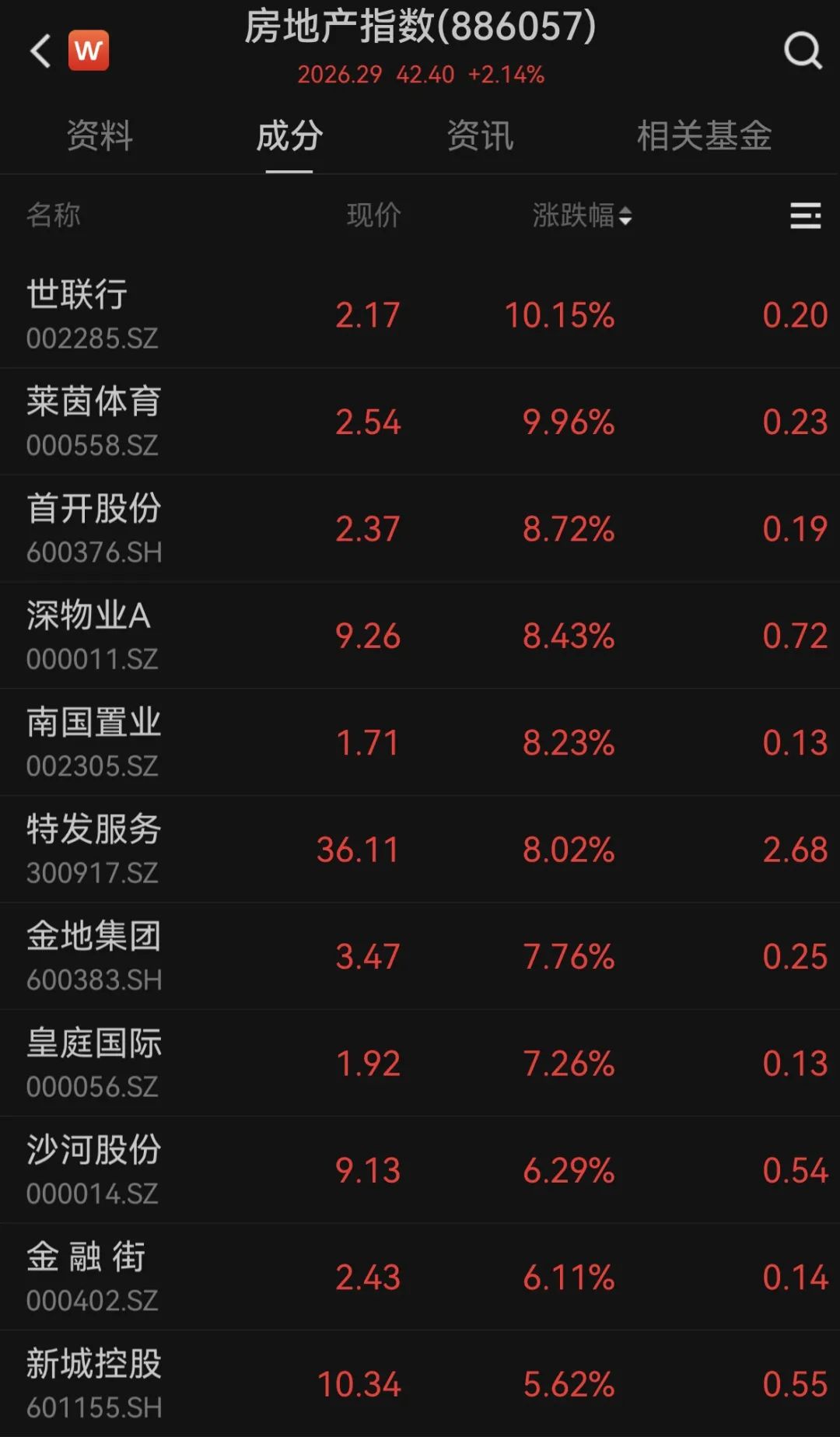 8月9日,房地产板块持续活跃,城中村改造、房屋租赁、新型城镇化等概念涨幅居前。世联行4天3板,首开股份(维权)、金地集团、南国置业一度涨停,新城控股一度涨超7%,万科A盘中涨超5%,信达地产、滨江集团、保利发展等跟涨。