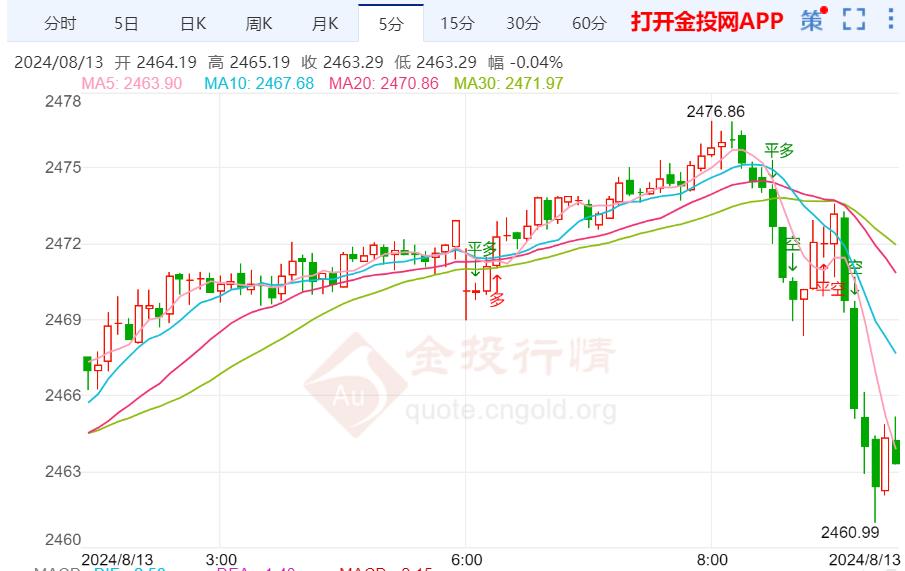 周二(8月13日)本交易日现货黄金日内维持震荡走势,今日开盘报2468.58美元/盎司,最高触及2476.86美元/盎司,最低触及2460.99美元/盎司,截止发稿金价报2464.52美元/盎司,跌幅0.37%。