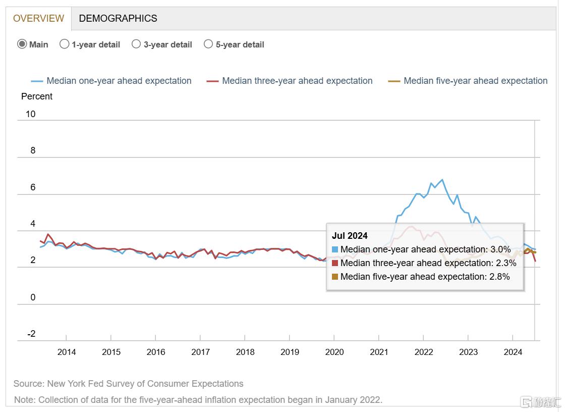 根据报告,7月份美国消费者一年、五年期通胀预期维稳,三年期通胀预期大跌,同时创下数据记录以来最低记录。
