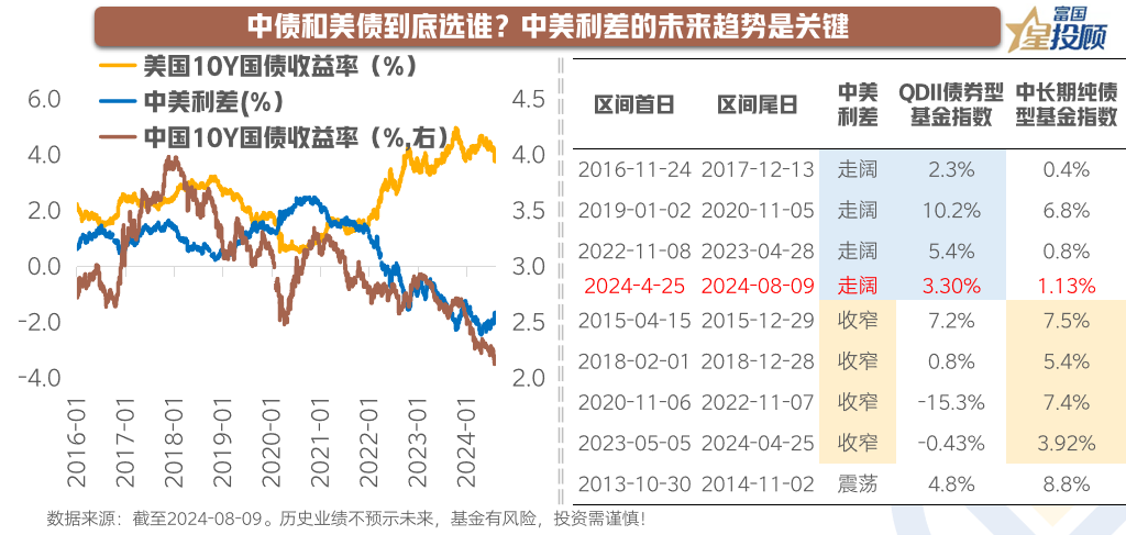 中美利差的走阔,通常是在美债收益率下行时完成,较少出现中、美收益率均下行时的利差走阔。此时,美国债券的价格上涨速度,远快于中国债券价格,QDII债基表现优于境内债基。