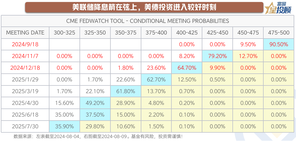 从当前利率期货显示的市场预期看,美联储在2024年9月降息的概率已上升至100%。目前市场的主流预期已经从9月降息25BP,到9月降息50BP,甚至是降息75BP的演绎。当降息预期上升时,美债投资进入到较好的时刻。近期,投资于美债的QDII基金,呈现出更好的净值表现。