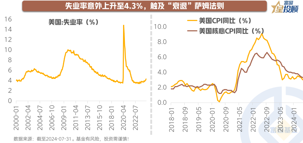 萨姆法则指的是失业率的三个月移动平均值比过去一年的低点高出0.5个百分点,就意味着经济衰退已经开始。美国7月失业率意外上升至4.3%,为2021年10月以来的新高,触发预示经济衰退的萨姆法则。