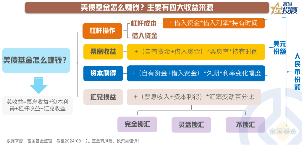 与国内债券基金相同,美债基金的主要收益来源于三大方向:票息收益、资本利得,以及杠杆收益。但与国内债券基金不同的是,美债基金还面临着汇兑损益。