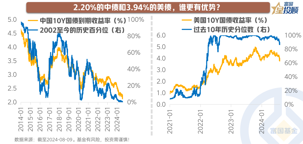 一方面,中国10年期国债收益率为2.20%,已处于2002年以来的最低位水平,估值并不低。另一方面,美国10年期国债收益率为3.94%,已经处于过去十年80%以上的分位数水平,估值相对较低。