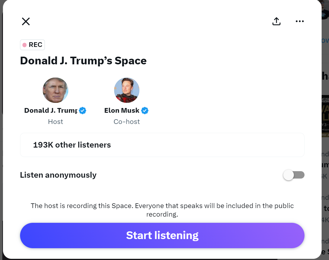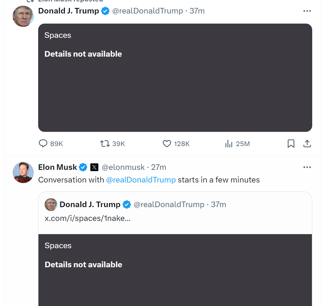 这场原定于美国东部时间晚上8点开始的访谈,由于技术故障被迫推迟。许多试图收看这一访谈的X用户试图在访谈开始前加入直播空间,但收到了“此空间不可用”的提示,无法顺利进入直播空间。