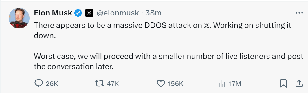 面对这一突发状况,马斯克回应称,X平台似乎遭到了大规模的DDOS网络攻击,导致用户在访问访谈时遇到困难。