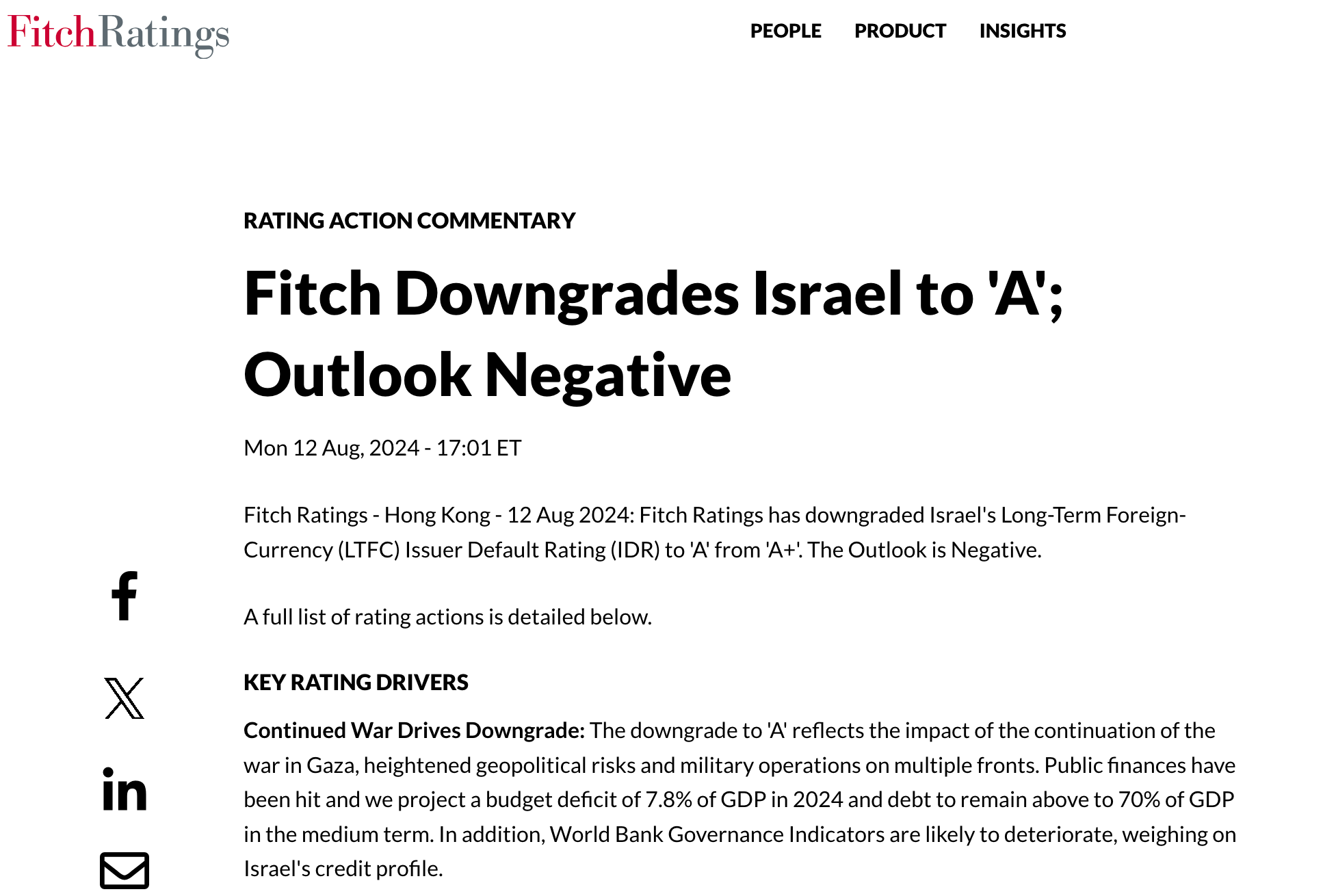 包括Cedric Julien Berry和Jose Mantero在内的惠誉分析师写道,评级下调“反映了加沙战争持续、地缘政治风险加剧和多条战线军事行动的影响”。