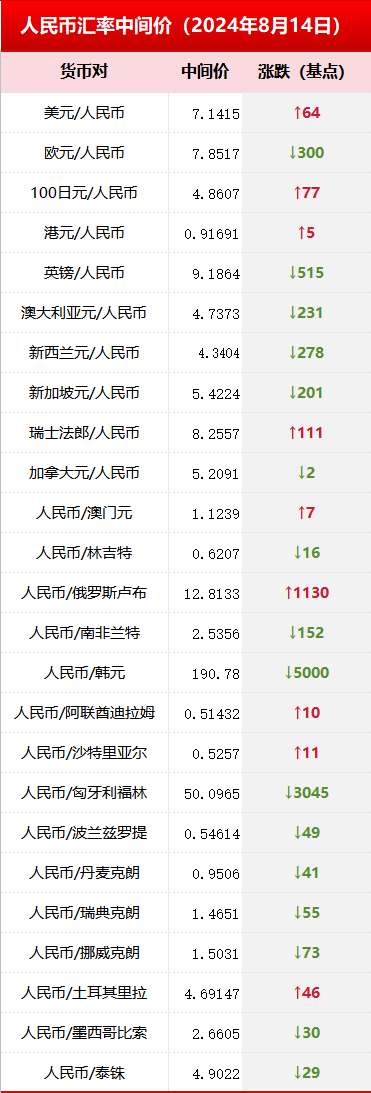 中国人民银行授权中国外汇交易中心公布,2024年8月14日银行间外汇市场人民币汇率中间价,如下: