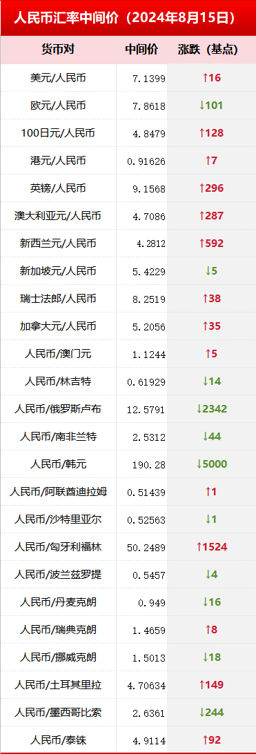 中国人民银行授权中国外汇交易中心公布,2024年8月15日银行间外汇市场人民币汇率中间价,如下: