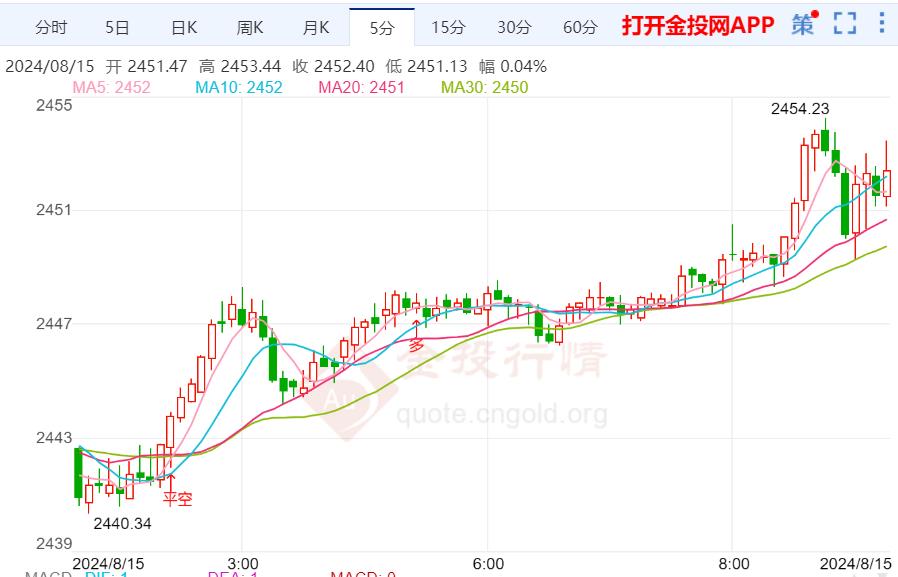 周四(8月15日)本交易日现货黄金日内维持震荡走势,今日开盘报2447.45美元/盎司,最高触及2454.23美元/盎司,最低触及2446.25美元/盎司,截止发稿金价报2450.18美元/盎司,涨幅0.12%。
