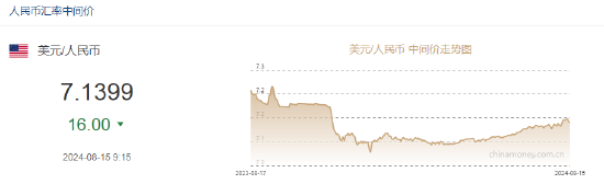 8月15日,人民币中间价报7.1399,上调16点,上一交易日中间价报7.1415。