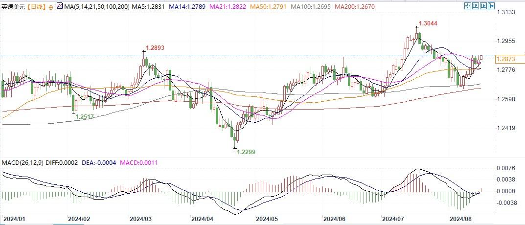 英镑兑美元日线图北京时间8月16日10:43,英镑兑美元报1.2874/75