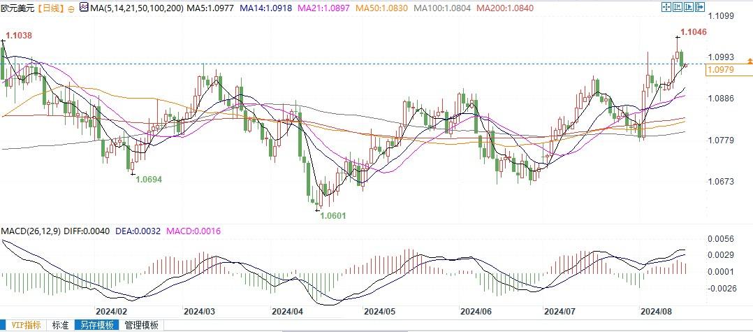 欧元兑美元日线图北京时间8月16日9:53,欧元兑美元报1.0979/80