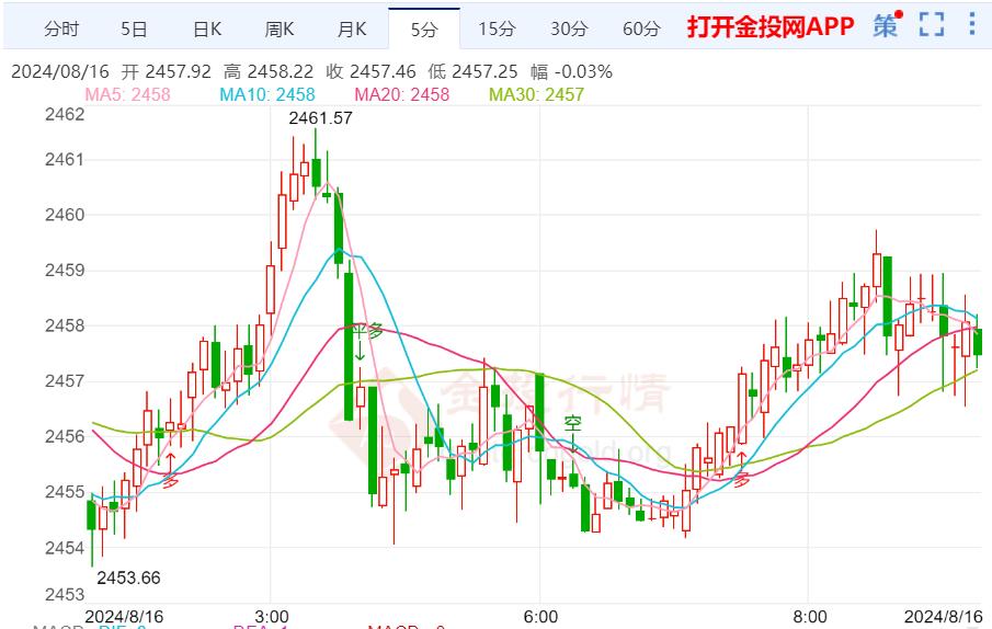 周五(8月16日)亚市早盘,现货黄金窄幅震荡,目前交投于2458.45美元/盎司。金价周四震荡运行,盘中最高涨至2470关口附近,但因为初请数据和“恐怖数据”表现强劲,美债收益率上涨,金价一度跌至2432美元附近,随后受到逢低买盘和避险买盘支撑,收报2456.35美元/盎司。