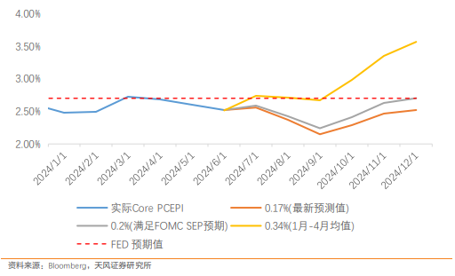 市场寻求在报告中看到更多的去通胀价格信号,但最明显的还是“车”与“机票”这些老面孔。物价数据对于验证“衰退交易”的效力相对有限,因此“降息交易”并未随着通胀数据出现明显调整。 对于激进降息的拥护者,通胀同比水平的持续走低以及大幅通缩的核心商品是最直接的论据;而对于谨慎降息的支持者,仍居高位的住房通胀以及以车险为主的其他服务通胀所带来的不确定性,使得其倾向于“再等等看”。 天风证券认为“紧盯通缩分项进而得出降息”的结论是不正确的,因为众多的广义必需品通胀水平仍然较高;期待通胀回到 2%的联储目标或者疫情前水平,也是不现实的。重点在于联储如何权衡降息后通胀潜在的反弹可能。更何况,对于联储最青睐的核心 PCE 数据而言,2024 年剩下的月份都将面临不利的基数效应,同比读数也难看到大幅的改善,更有可能在当前水平之上反弹。 无论 PCE 的环比增速如何,在去年极低的基数作用下,从 9 月开始的反弹都是大概率事件。联储在通胀潜在反弹的背景下降息需要更加充足的理由。