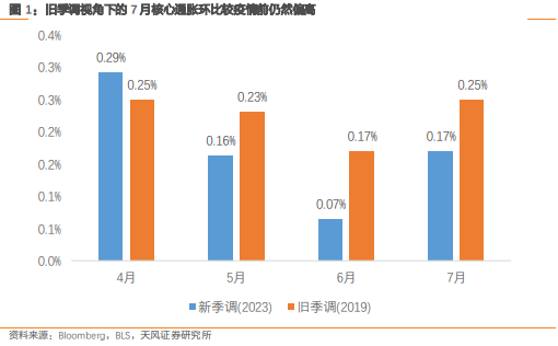 在上个月报告中(《联储降息或不是最优选择》,2024 年 7 月 13 日),天风证券提到季调因子 压低了近期的通胀读数。天风证券延续这一调整方法,该方法计算下的 7 月核心通胀环比在 0.25%左右,从可比性的角度来看,还是明显高于疫情前水平。