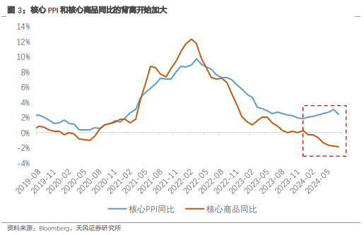 7 月通胀数据传递的信号也依然矛盾: 2023 年 6 月以来最高的主要居所环比增速(0.49%)意味着住房的去通胀进程仍存波折,且其同比读数已有所反弹,整体住房通胀同比下行也进一步放缓;住房通胀传递的是 “不降息、缓降息”的信号。而环比下跌 2.3%的二手车价格以及受其拖累明显的核心商品则传递出较强的“降息”信号。对利率较为敏感的核心商品价格同比已经下行至-1.9%,自 1958 年以来仅有 2003 年 Q3 的数月达到过如此水平。尽管二手车价格低迷,但美国的汽车销量却保持在相对稳健的水平。 进入 2024 年之后,本应同步的美国 PPI 与核心商品同比增速的背离幅度进一步加大。考虑到当前美国商品消费占比较疫情前提升了约 2 个百分点,核心商品价格的历史性通缩可能很难持续。