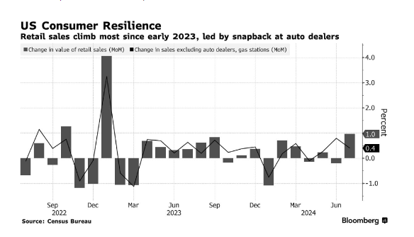 据中国基金报,斯巴达资本证券公司首席市场经济学家Peter Cardillo表示,8月15日的关键数据是零售销售,它表明美国消费水平显然比预期的要强劲得多。这减少了人们对经济衰退的担忧,对股市来说是个好消息。有了这份报告,我们又回到了起点,美联储可能在9月份降息25个基点,更大幅度降息50个基点的可能性正在减少。今天的零售销售对美国企业来说是积极的,这对企业盈利来说是个好兆头。