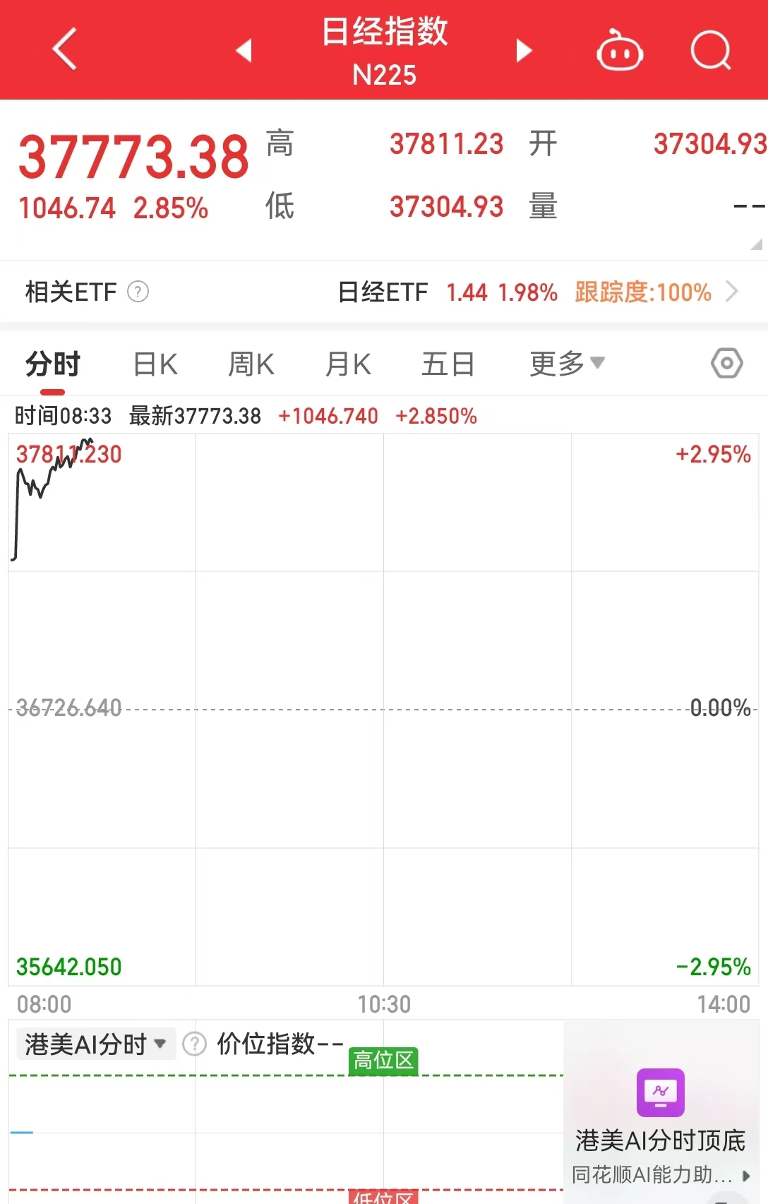 截至发稿,日经225指数报37773.38点,涨幅2.85%。