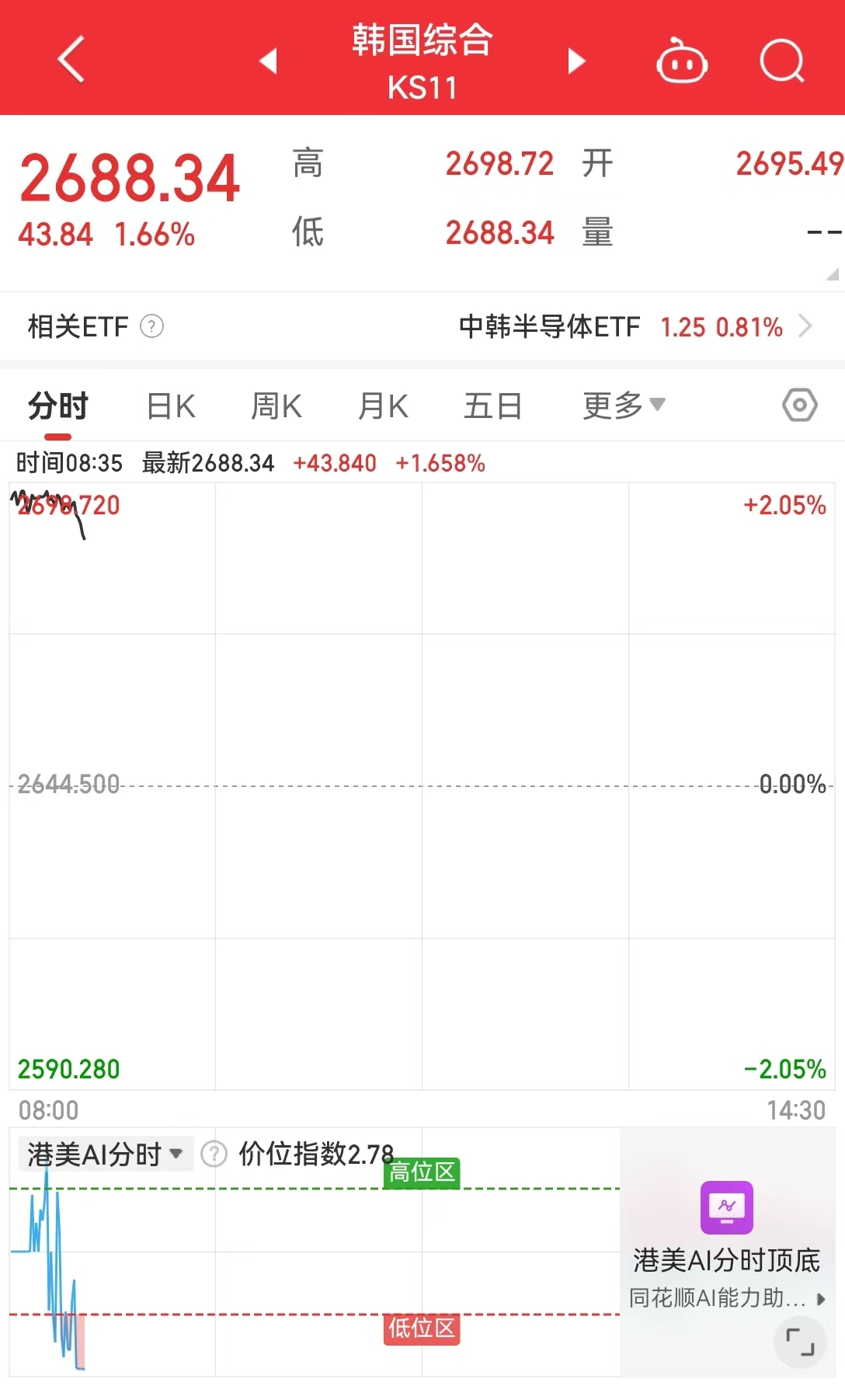 韩国综合指数(KS11)报2688.34点,涨幅1.66%。