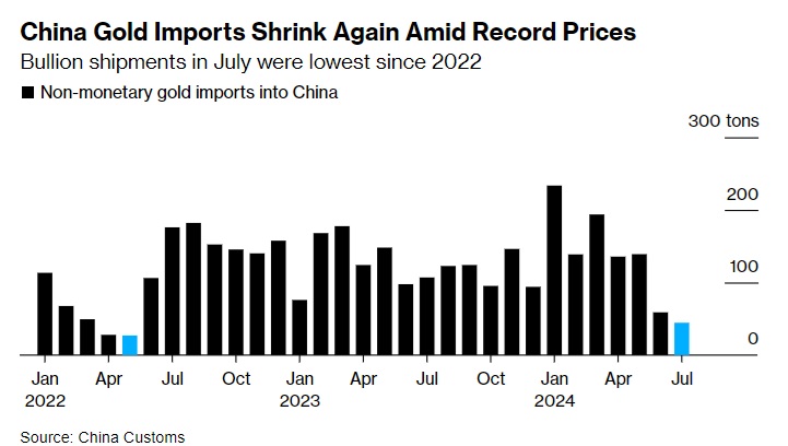 中国海关周二公布的数据显示,7月份黄金进口量下降24%,至44.6吨,为两年多来的最低水平。在此之前,6月份的进口量降幅更大,较上月暴跌58%。