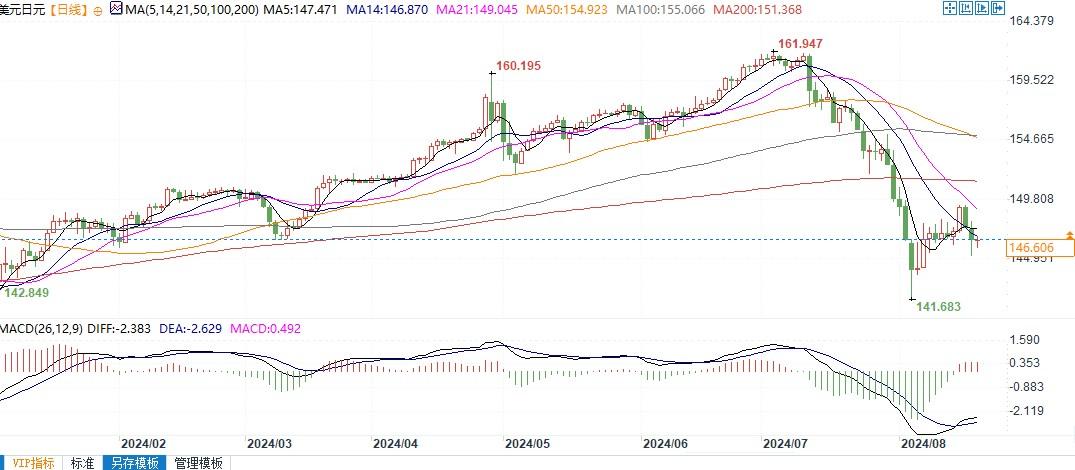 美元兑日元日线图北京时间8月20日10:11,美元兑日元报146.60/61