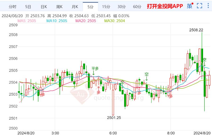 周二(8月20日)本交易日现货黄金日内维持震荡走势,今日开盘报2501.25美元/盎司,最高触及2508.22美元/盎司,最低触及2501.25美元/盎司,截止发稿金价报2505.00美元/盎司,涨幅0.03%。昨日美国三大股指纷纷收涨,道琼斯工业指数收涨0.58%,标普500指数收涨0.97%,科技股为主的纳斯达克指数收涨1.39%。