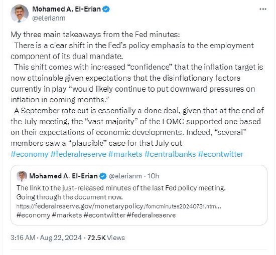 安联首席经济顾问默罕默德·埃尔-埃利安周三的在一篇帖子中总结了“美联储会议纪要的三大要点”,认为美联储将把关注点转向就业,暗示9月降息几乎是肯定的。