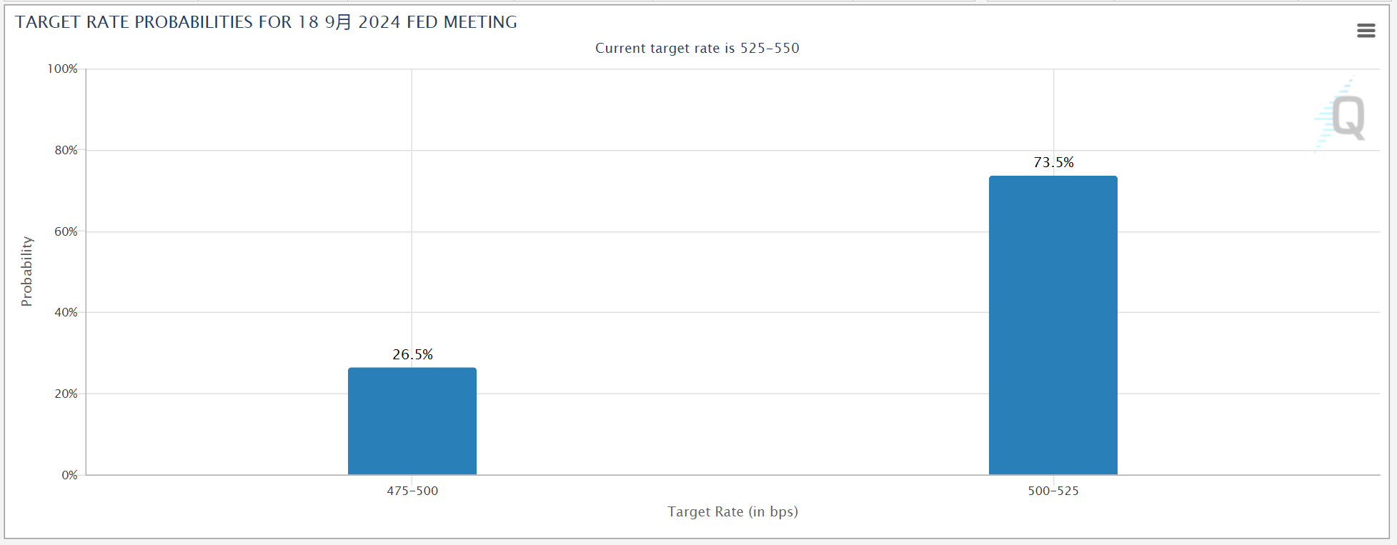根据美联储观察工具,目前市场预计9月降息25个基点的概率高达73.5%,降息50个基点的概率为26.5%。
