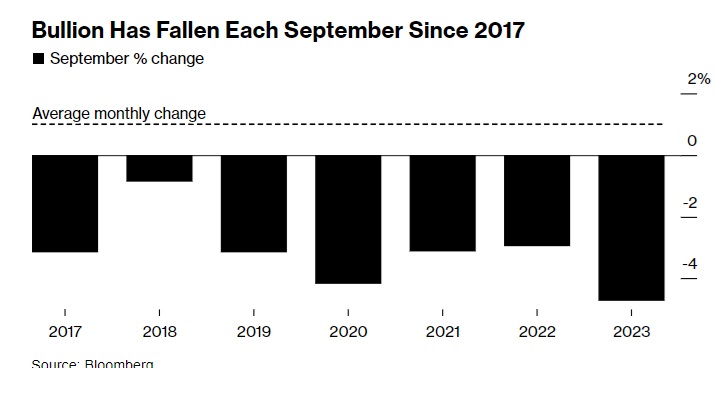 自2017年以来,黄金在每年9月份都出现下跌,平均跌幅达到3.2%。这无疑是黄金一年中表现最糟糕的月份,远逊于1%的月平均涨幅。