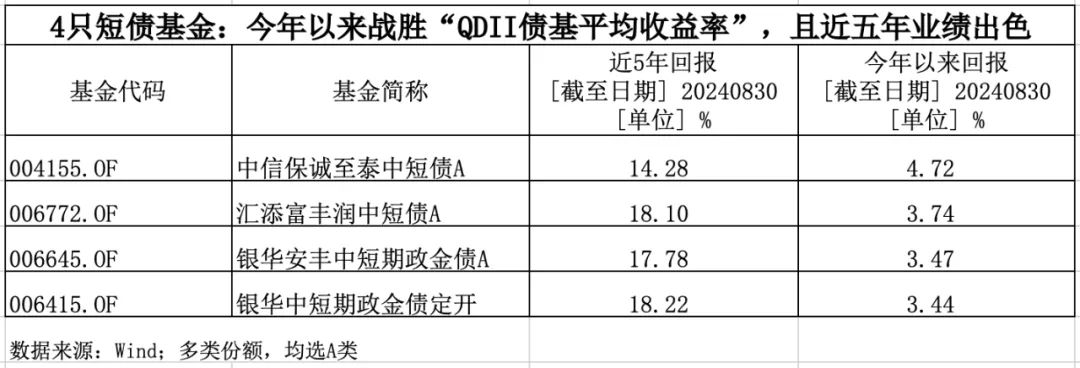 整理后发现,中信保诚至泰中短债、汇添富丰润中短债、银华安丰中短债政金债、银华中短期政金债3个月定开,一共有4只短债纯债基金,今年以来收益率跑赢QDII债基平均收益率,并且近五年长期业绩表现出色。