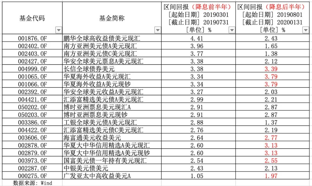 Wind数据显示,2019.3.1-2019.7.31(开启降息前半年),19只以美元计价的QDII债券基金,平均收益率为3.01%,2019.8.1-2020.1.31(开启降息后半年),19只QDII债基平均收益率为2.51%。