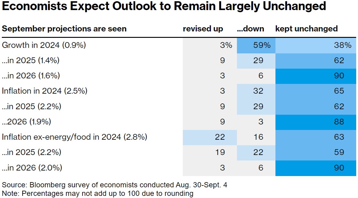 受访者预计,欧洲央行将下调2024年的增长预期,6月份的预测为0.9%。它可能会维持其预测的其余部分不变。