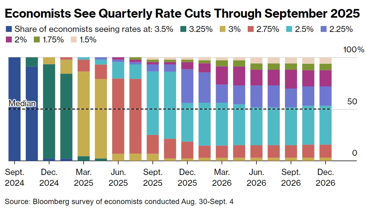 受访者预计,继6月份首次下调存款利率之后,欧洲央行下周将再次下调存款利率,保持季度降息速度直到明年9月达到2.5%。他们预计,到2026年,借贷成本都将维持在这一水平。