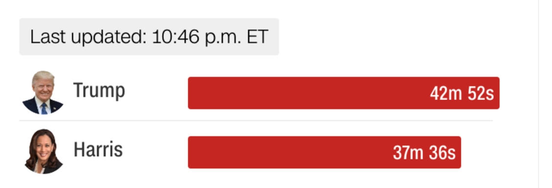 在辩论的开场,两人登台时,哈里斯主动与特朗普握手尽管原定的辩论时间为90分钟,但由于两位候选人都频频抢过话头互相辩驳,这场辩论最终的时长达到了超过100分钟。其中,特朗普发言约42分52秒,哈里斯发言约37分36秒。