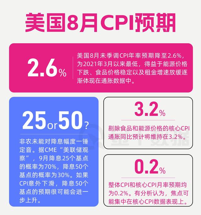 据CME“美联储观察”,美联储9月降息25个基点的概率为70%,降息50个基点的概率为30%。如果通胀出现意外下滑,降息50个基点的预期很可能会进一步上升。另一方面,如果报告结果符合预期,甚至显示出通胀压力的微幅上升,虽然不会改变市场对美联储此次利率调整的预期,但可能在某种程度上抑制随之而来的鸽派言论。