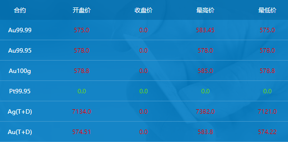 此外,上海黄金交易所“上海金”9月13日开盘价格同样普涨。截至记者发稿,上海金Au99.99合约开盘价为575.0元/克,最高价583.45元/克;Au99.95合约开盘价578.0元/克;Au100g合约收盘价578.8元/克,最高价585.0元/克;Au(T+D)合约开盘价574.51元/克,最高价583.8美元/克。