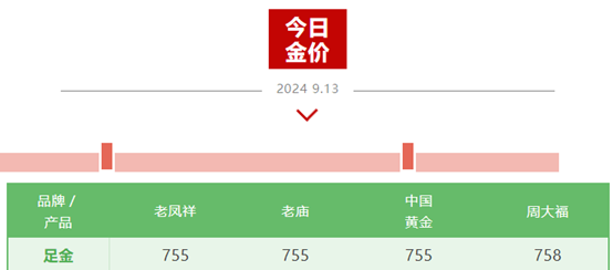 上海黄金饰品行业协会数据显示,9月13日,足金价格方面,老凤祥报755元/克、老庙报755元/克、中国黄金报755元/克、周大福报758元/克。