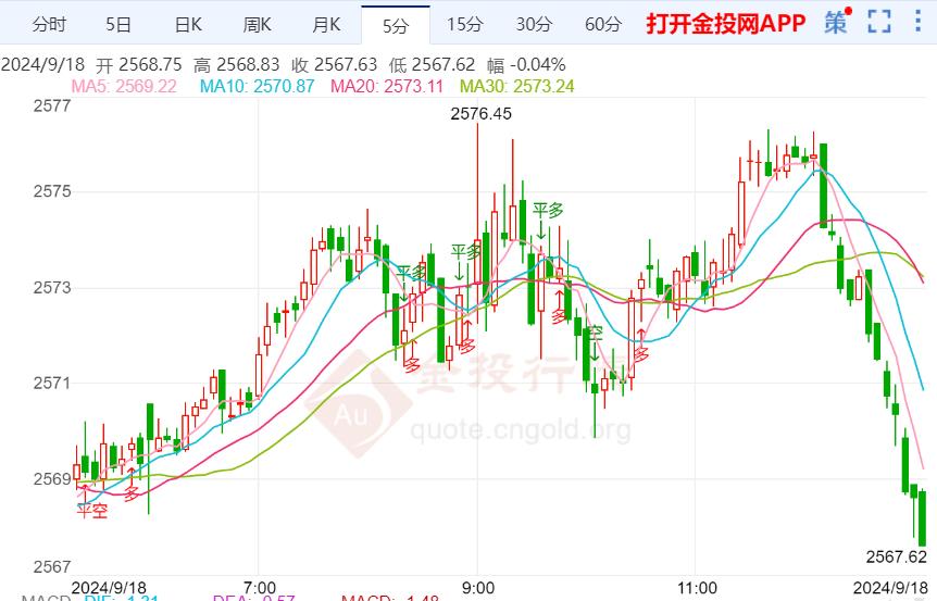 周三(9月18日)本交易日现货黄金日内维持震荡走势,今日开盘报2571.28美元/盎司,最高触及2576.45美元/盎司,最低触及2567.39美元/盎司,截止发稿金价报2565.84美元/盎司,跌幅0.14%。