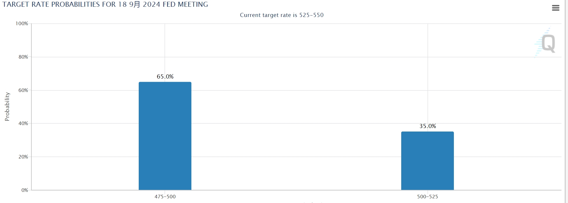 据CME美联储观察工具显示,目前市场已经基本认定美联储将在9月降息,但降息幅度预期存在分歧:上次认为美联储有65%概率降息50基点,35%概率降息25基点。