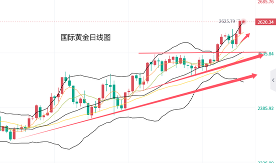 从之后的走势看,黄金小幅回落至2584美元企稳,欧盘开盘后向上突破2600美元整数位置,开始继续创造历史新高,期间金价涨至2612美元与2619美元时,均遇阻回落至2602美元企稳,最高涨至2625美元,收盘价2622美元,表现十分强势。总体看,黄金再创新高,与我们金价向上突破2600美元后,关注2600美元整数支撑看涨,且上不猜顶的观点,基本保持一致。