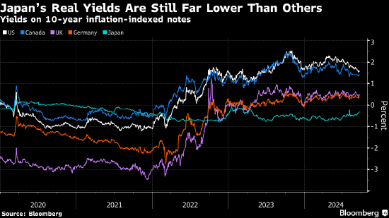即使在日本央行开始收紧政策之后,日本整体收益率曲线仍然低于该国通胀率。这与美国等其他主要经济体形成鲜明对比,美国等其他主要经济体的所谓实际收益率为正,使得这些市场对日本资金具有吸引力。