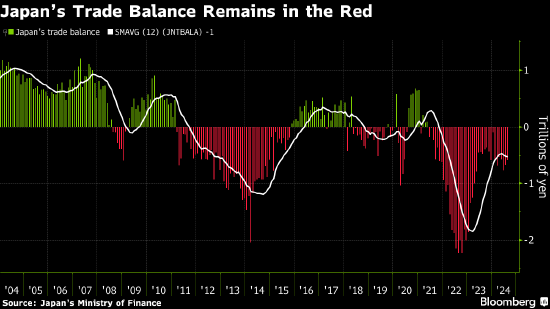 日本贸易差额也情况类似。赤字已经较2022年达到的峰值收窄,但经过季节性调整,余额已经连续三年低于零。