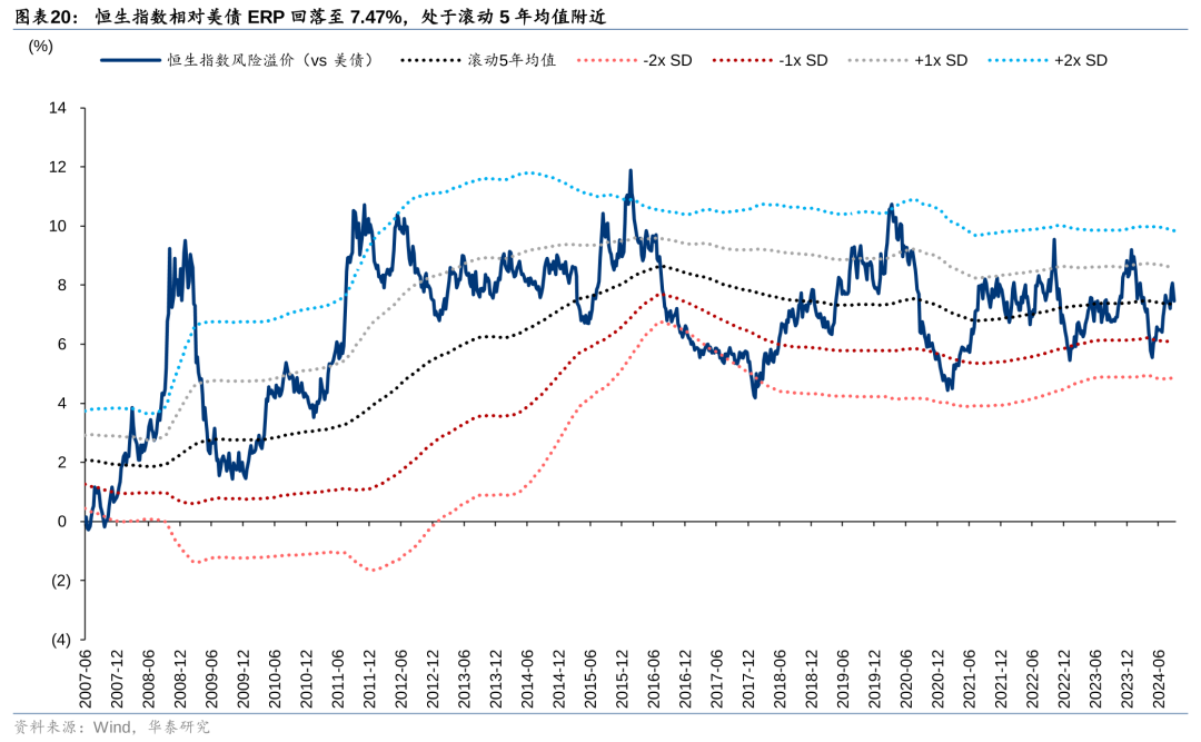 截至9月20日,恒生指数PETTM回升至8.9x,风险溢价(相对美债)回落至7.47%,处于滚动5年均值附近。从PB-ROE视角看,恒生指数、恒生国企指数在全球主要股指中具备性价比。