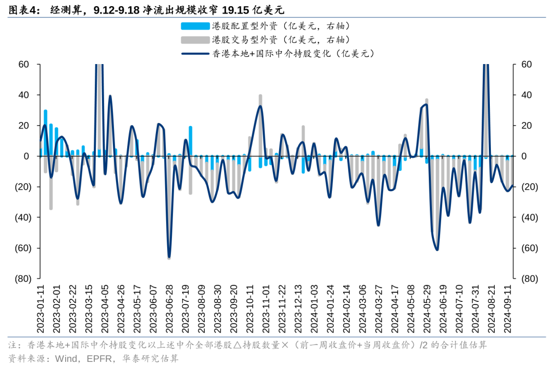 交易型外资净流出规模收窄。以Wind统计的香港本地及国际中介持股变化估算流量(近似代表港股外资流量),与EPFR口径下港股配置型外资流量的差值,近似代表港股的交易型外资,上周净流出规模收窄19.15亿美元(vs 前一周净流出22.72亿美元)。